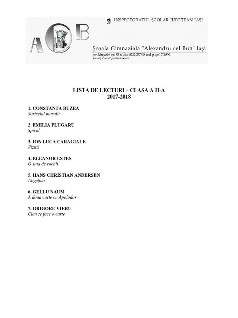 6 Lista De Lecturi Clasa A Ii A 2017 2018