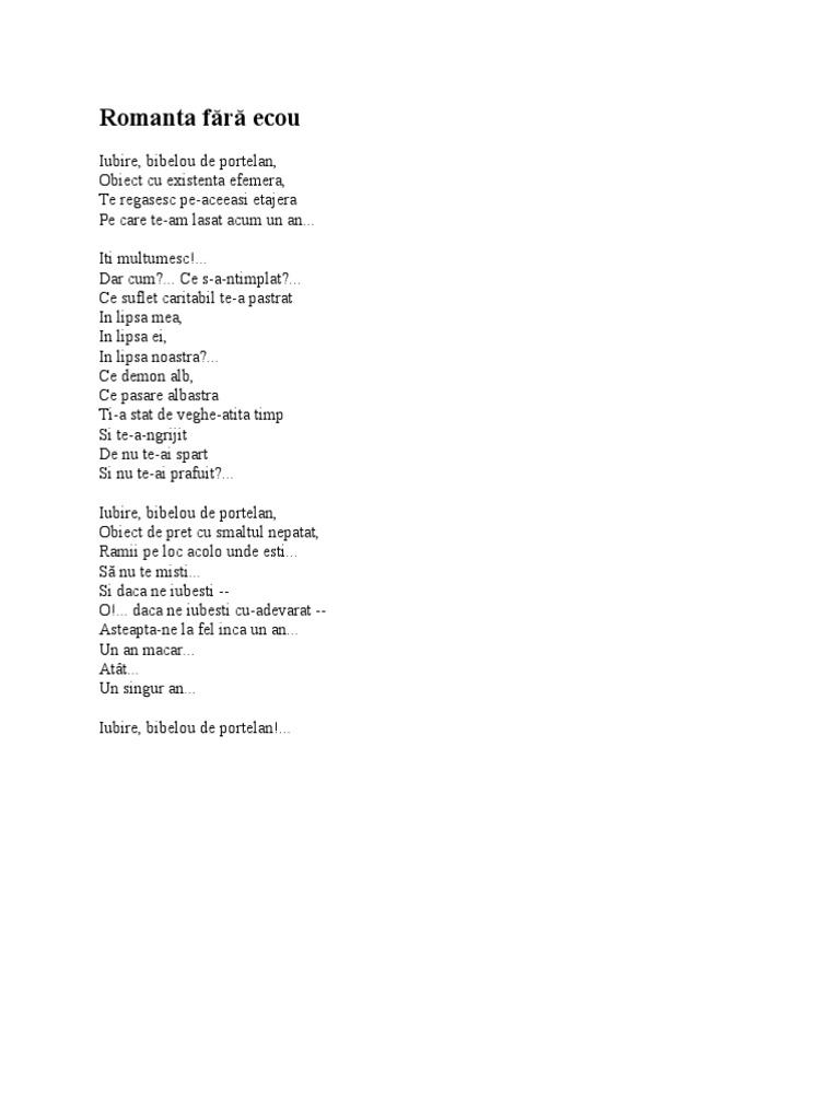 Formația mondial iubire bibelou de porțelan obiect cu existenţa efemeră te regăsesc pe aceeaşi etajeră pe care te am lăsat acum un an. Ion minulescu romanta fără ecou. Dar ce anume a fost ce am vrut sa fie. Romanta fara muzica ca sa ajung pana la tine ca sa ajung pana la tine i am zis calului.
