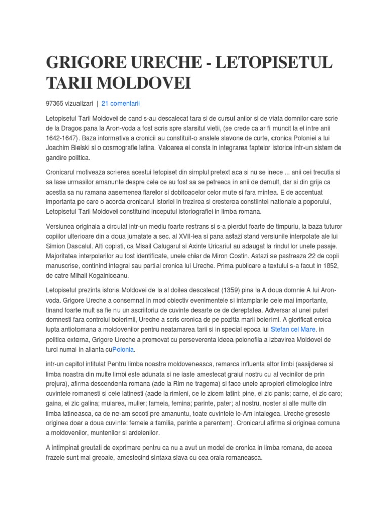 Rezumat Letopisetul Tarii Moldovei De Grigore Ureche