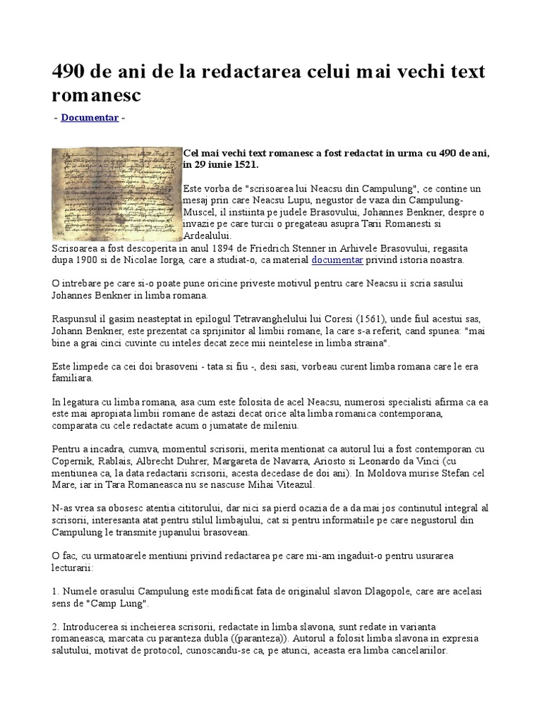 Preaînţeleptului şi cinstitului şi de dumnezeu dăruitului jupân hanăş bengner din braşov multă sănătate din partea lui neacşu din câmpulung n. în anul 1521 la câmpulung a fost redactat primul document scris compact şi unitar în limba română. Primul text în limba română scrisoarea lui neacșu 29 30 iunie 1521 tipărire email. Datorită jurnalului ținut de turci istoricii au putut data scrisoarea lui neacșu.